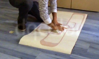 3-. Extendemos el vinilo con sus dos papeles protectores, sobre una superficie lisa como el suelo o una mesa grande y ayudándonos de un carnet o tarjeta de crédito, envuelto en un paño de tela suave, frotamos bien sobre todo el papel para sacar posibles burbujas de aire y alisar imperfecciones del papel protector. |