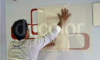 5-. Despegamos suavemente la mitad del papel protector del vinilo y pegamos el vinilo, directamente, con cuidado a la pared y después hacemos lo mismo con la otra mitad dejando el papel adhesivo sin retirar. Debemos ser precavidos en dejar todo el vinilo adherido al papel adhesivo transportador (transparente). |